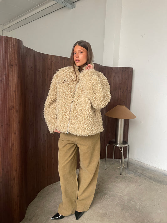 Zipped Loose Fit Curly Sheep Jacket Beige