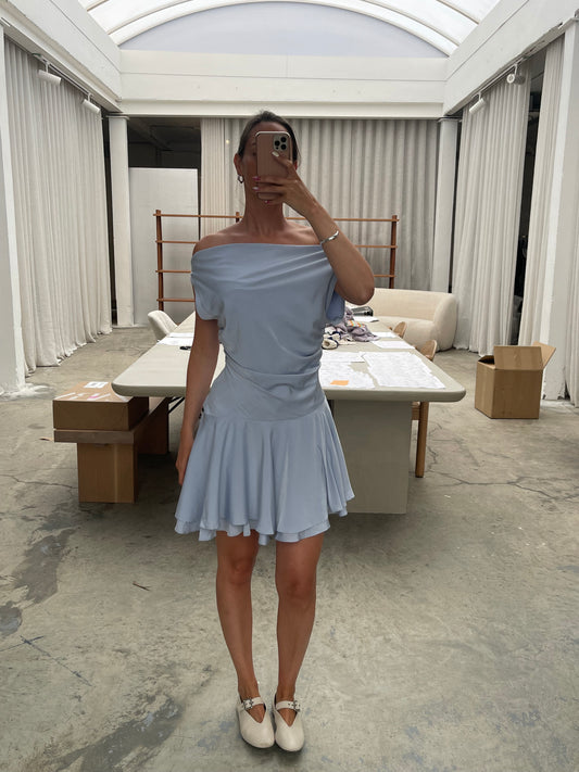 Draped Off Shoulder Ruffled Mini Dress Sky Blue