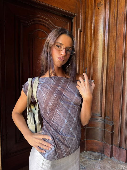 Draped Over Shoulder Checked Top Burgundy