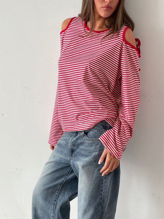 Gestreiftes T-Shirt mit Cut-Out und Banddetail Rot